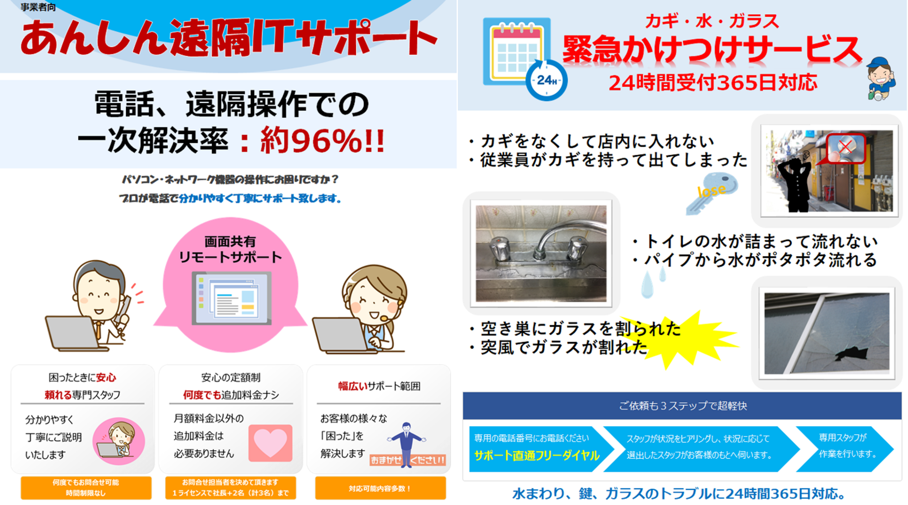 あんしん遠隔ITサポート、カギ・水・ガラス緊急かけつけサービス をリリースいたしました いずれも販売店様のお客様をお任せいただけるサポート体制で運営し、販売店様のストック商材となるよう設計しております。