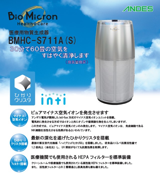 バイオミクロンサークル ヘルスケア BMHC-S711A(S) ■主な特徴 前機種と比較して抗菌・抗ウイルス性能が1.2倍UP ピュアマイナス空気イオン発生装置が標準搭載 医療機関でも使用されるHEPAフィルターが標準装備 ピュアマイナス空気イオン発生装置は、アンデス電気の技術により、 純度の高いマイナスイオンを発生させることができます。 これにより、心身リラックス効果などが期待されます。