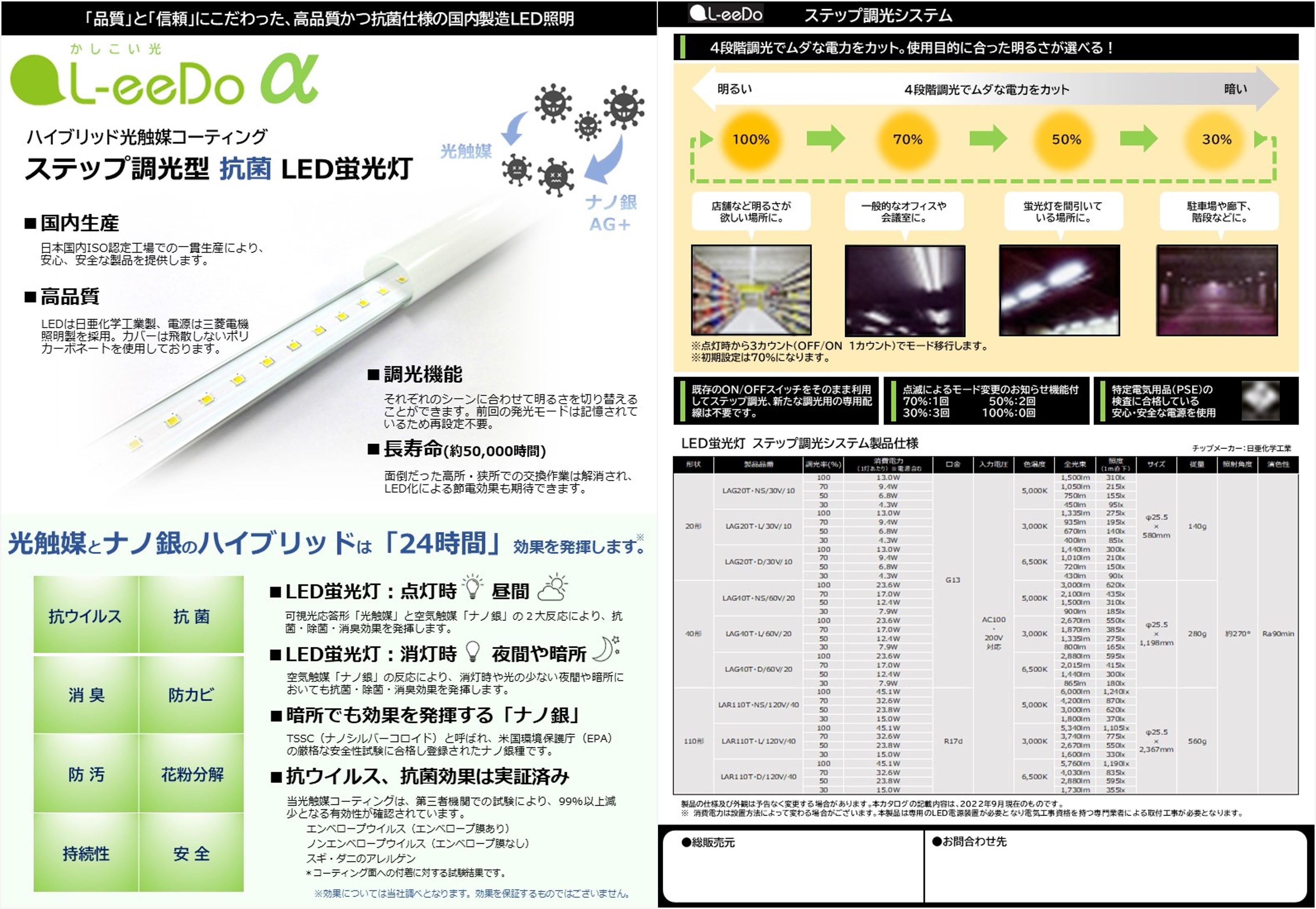 L-eeDo α ステップ調光型抗菌LED蛍光灯 L-eeDoシリーズ ステッップ調光にハイブリッド光触媒をコーティングしました。 ハイブリッド光触媒によりランプ部に抗菌・除菌・消臭効果を発揮します。